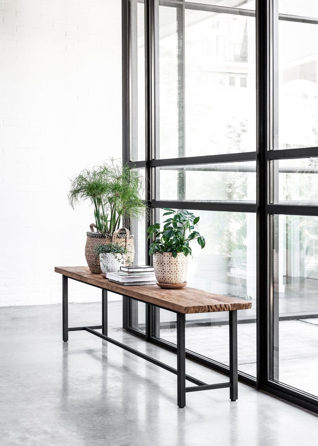 Eetkamerbank Beam is gemaakt van teakhout en is afgewerkt met een metalen frame. Het bankje heeft een afmeting van 47x190x35 cm en heeft een dikte van 3 cm.
