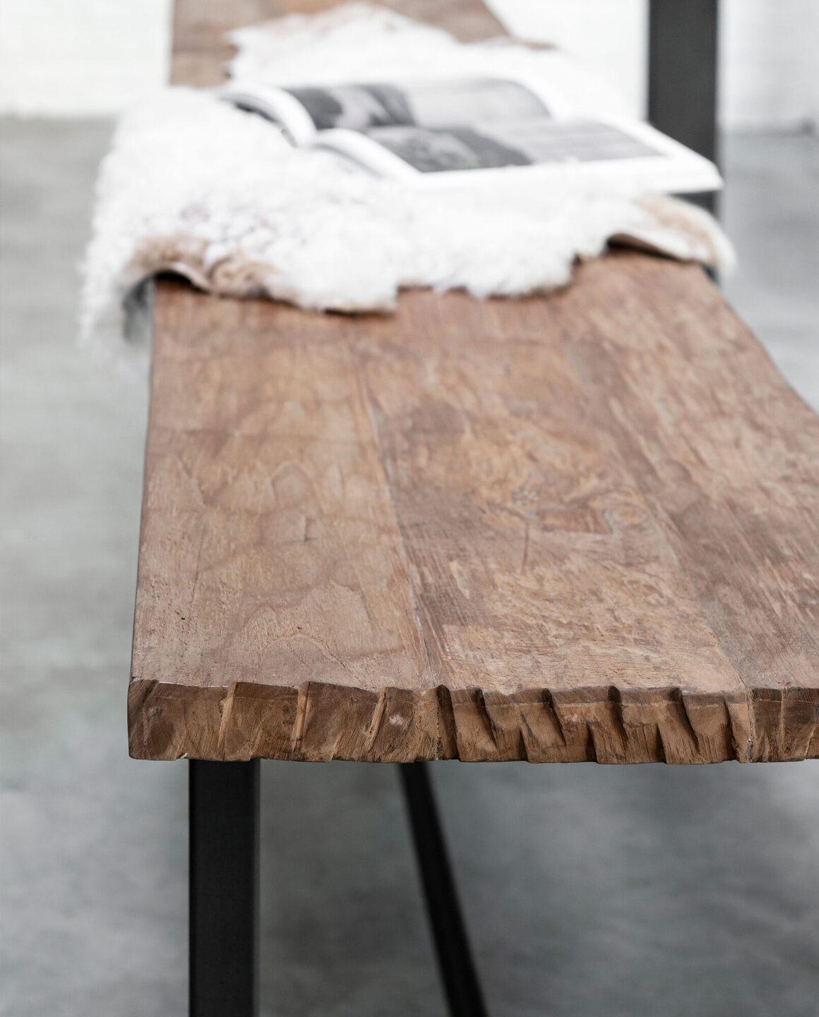 Eetkamerbank Beam is gemaakt van teakhout en is afgewerkt met een metalen frame. Het bankje heeft een afmeting van 47x215x35 cm en heeft een dikte van 3 cm.
