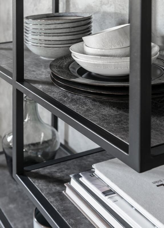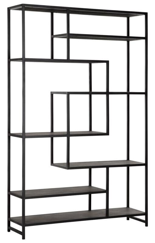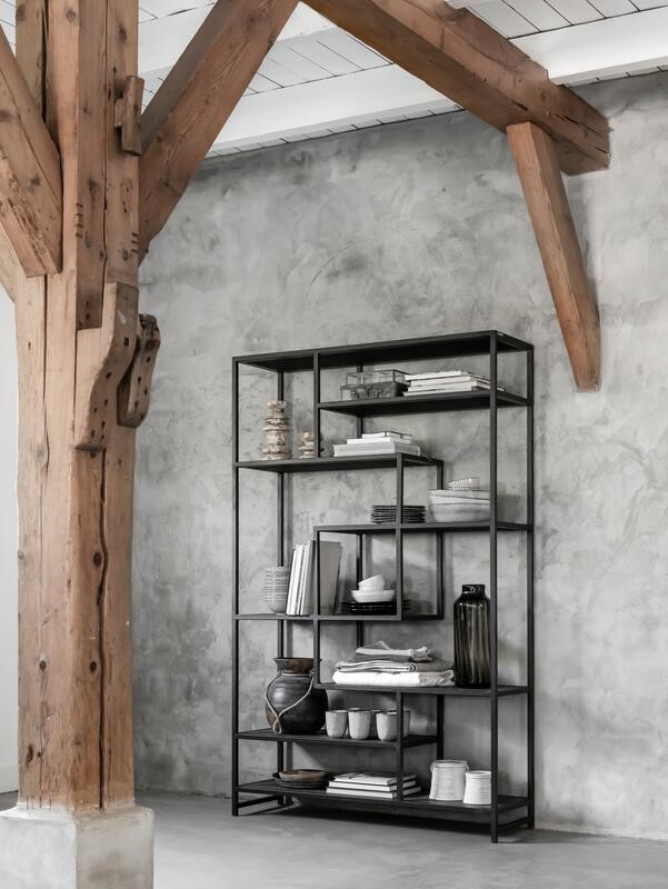Rek Harmony van het merk MUST Living heeft een afmeting van 190x120x35 cm. De planken zijn bekleed met gerecycled carlitto leer. Het rek is afgewerkt met een zwart metalen frame.