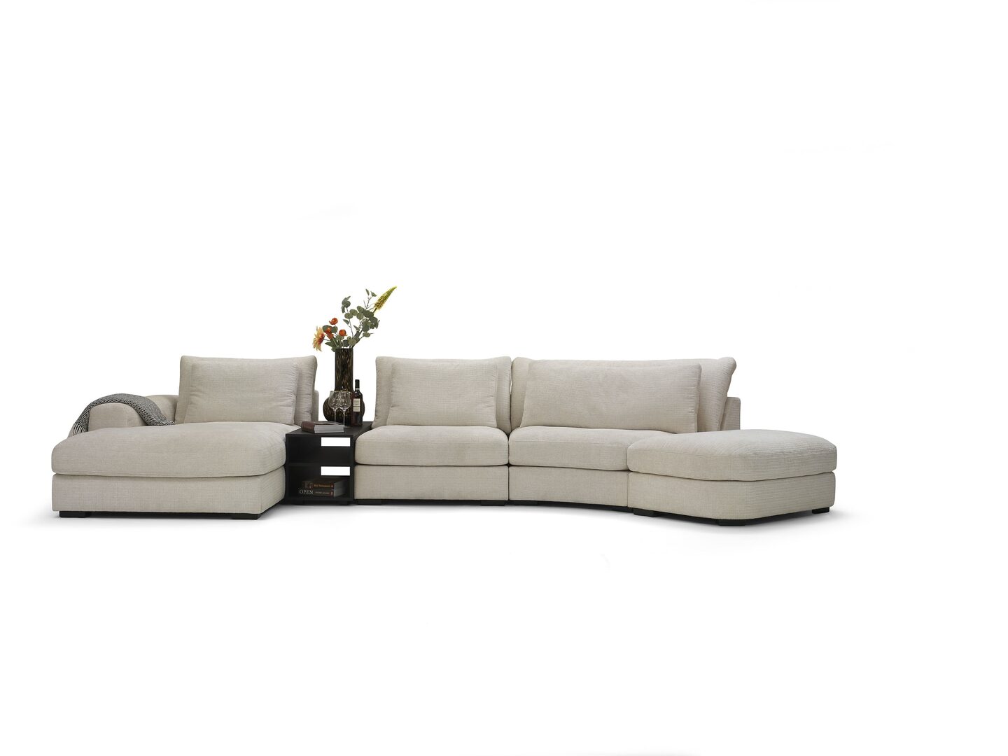 Chaise longue links 90 cm + tafelelement +1 zits tussenelement + hoek halfrond + hocker afgerond.