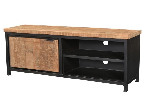 Deze mooie tv-meubel gemaakt van naturel hout en zwart metaal is alles wat jij nodig hebt in jouw interieur. Door het stoere uiterlijk kun je deze kast combineren met velen stijlen. De tv-meubel is een eenvoudig meubel waar je gemakkelijk al je spullen in kwijt kunt. Deze stoere kast bestaat uit 1 gesloten deur en 2 open legplanken. Hierin kun je gemakkelijk je spullen opbergen zoals je dvd’s of spelcomputers en bovenop nog alle ruimte op je televisie of andere accessoires te plaatsen. De tv-meubel is verpakt in één doos, uitpakken en klaar voor gebruik!
