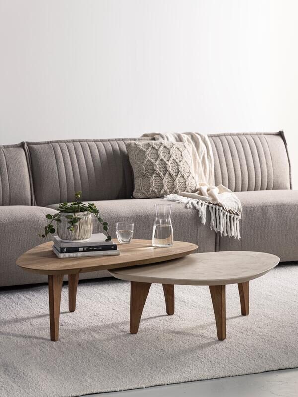 Met de Bliss salontafelset van DTP HOME haal je een prachtig samenspel van natuurlijke materialen en verfijnd design in huis. De combinatie van het robuuste teakhout en het strakke, minerale Mortex in de kleur pebble zorgt voor een rustige en tegelijkertijd karaktervolle uitstraling. Deze set biedt je de flexibiliteit om je zithoek naar eigen inzicht in te richten, waarbij de organische vormen zorgen voor een sfeervol en uitnodigend middelpunt in je woonkamer.