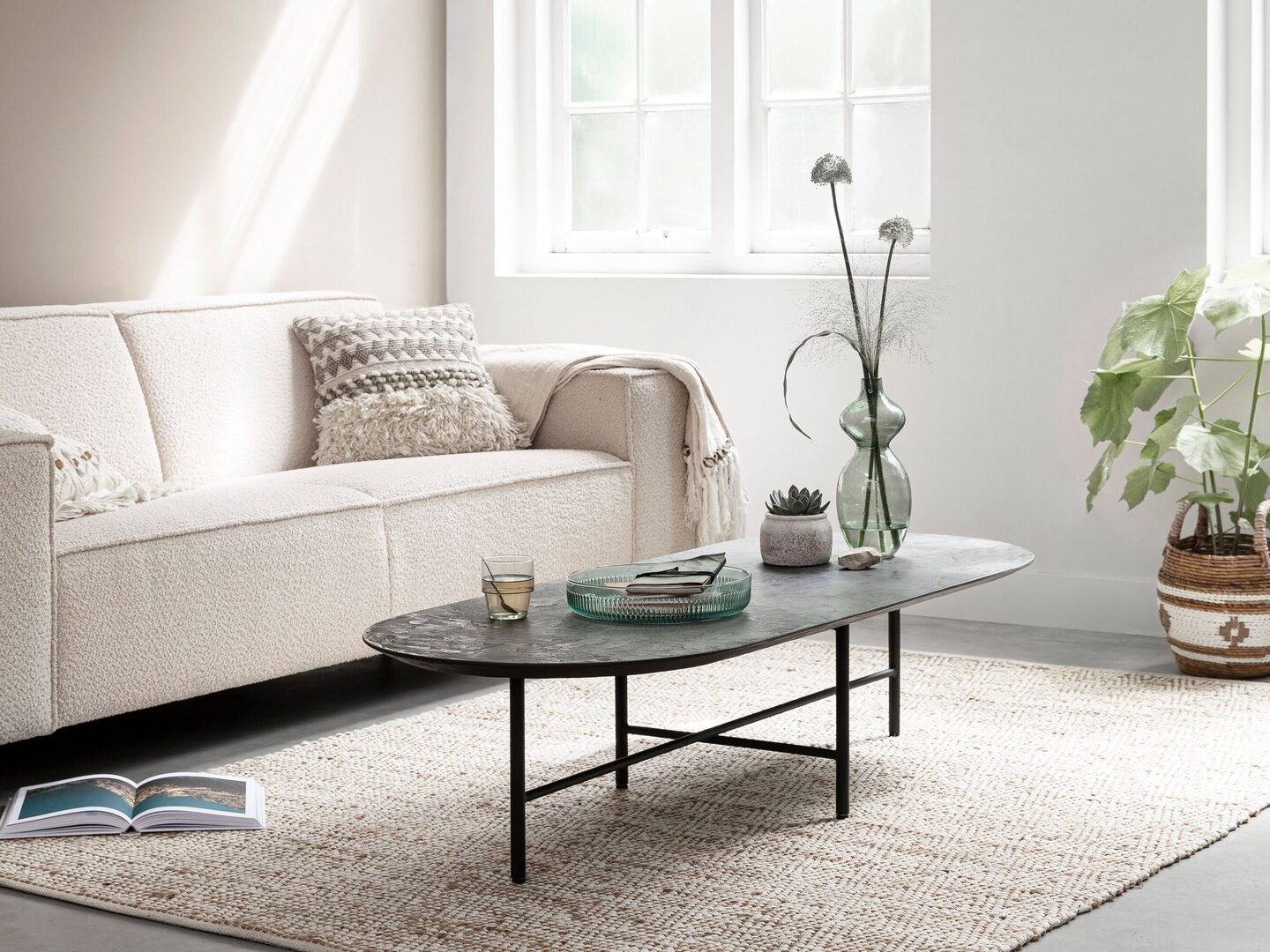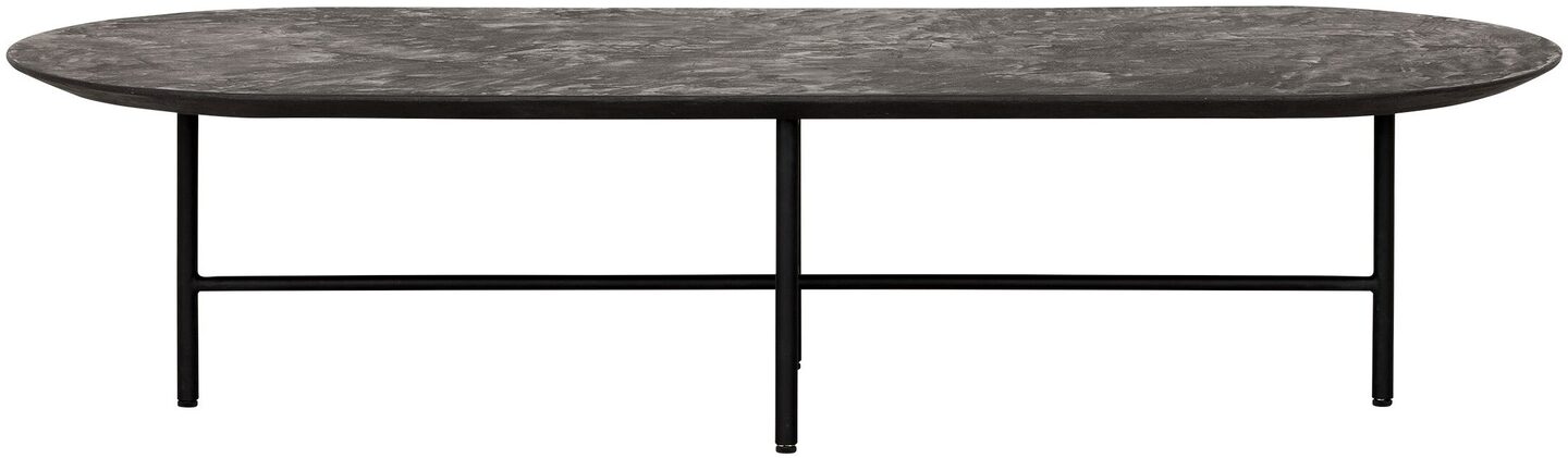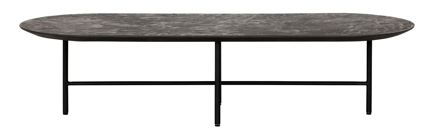 Salontafel SOHO heeft een afmeting van 150 x 60 x 35 cm. De tafel heeft een ovale vorm en het blad is gemaakt van mortex. De salontafel heeft een zwart metalen onderstel wat zorgt voor een luchtige uitstraling.
