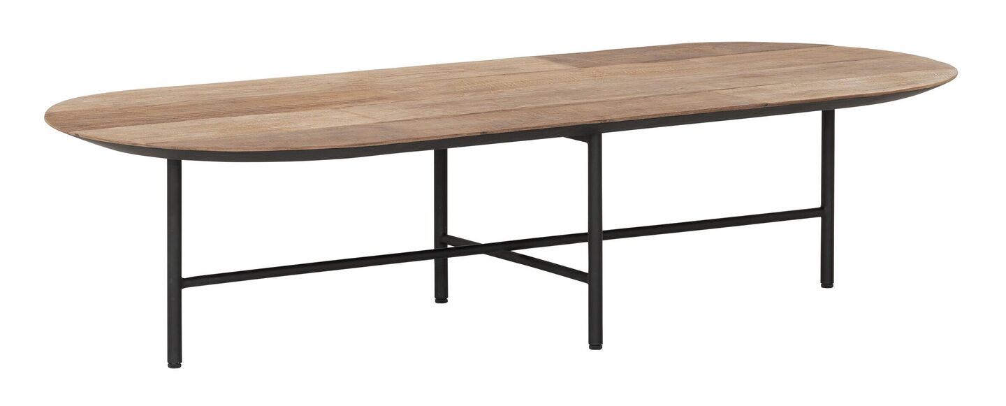 Salontafel SOHO heeft een afmeting van 150 x 60 x 35 cm. De tafel heeft een ovale vorm en is gemaakt van gerecycled teakhout dat met de hand is bewerkt. Hierdoor zijn de scheurtjes, lijnen en onregelmatigheden nog zichtbaar. De salontafel heeft een zwart metalen onderstel wat zorgt voor een luchtige uitstraling.