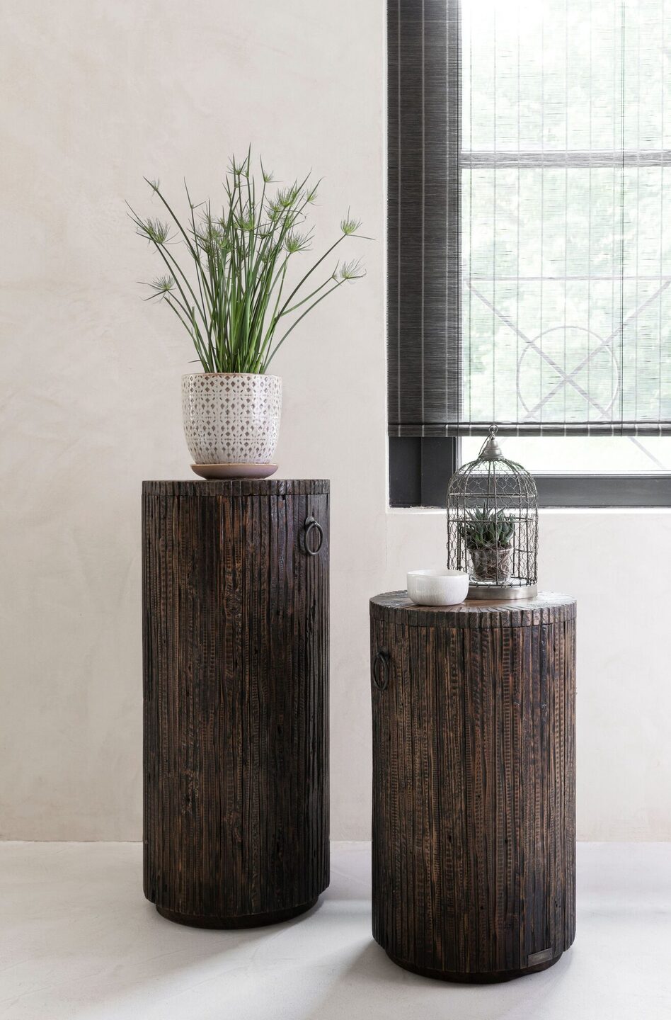 De wortels van teakbomen zijn de basis voor zuil Column Stripe. De wortels en bovenkant zijn met de hand gesneden en zwart gecoat. De afmetingen zijn 60xØ35 cm.