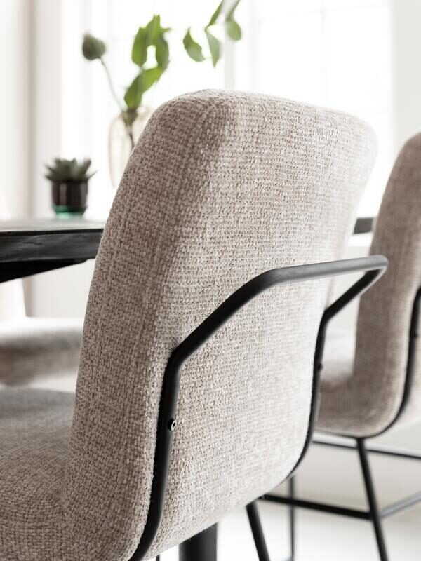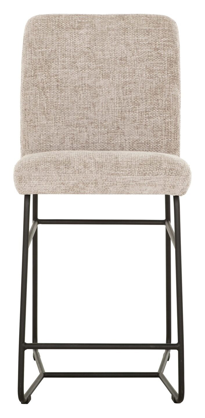Barstoel Zola uit onze Must Living heeft een afmeting van 1c4x45x55cm. De counter kruk is bekleed met prachtige aaibare stof, leverbaar inde kleuren zand en naturel. Daarnaast is de barstoel afgewerkt met een zwart metalen frame.