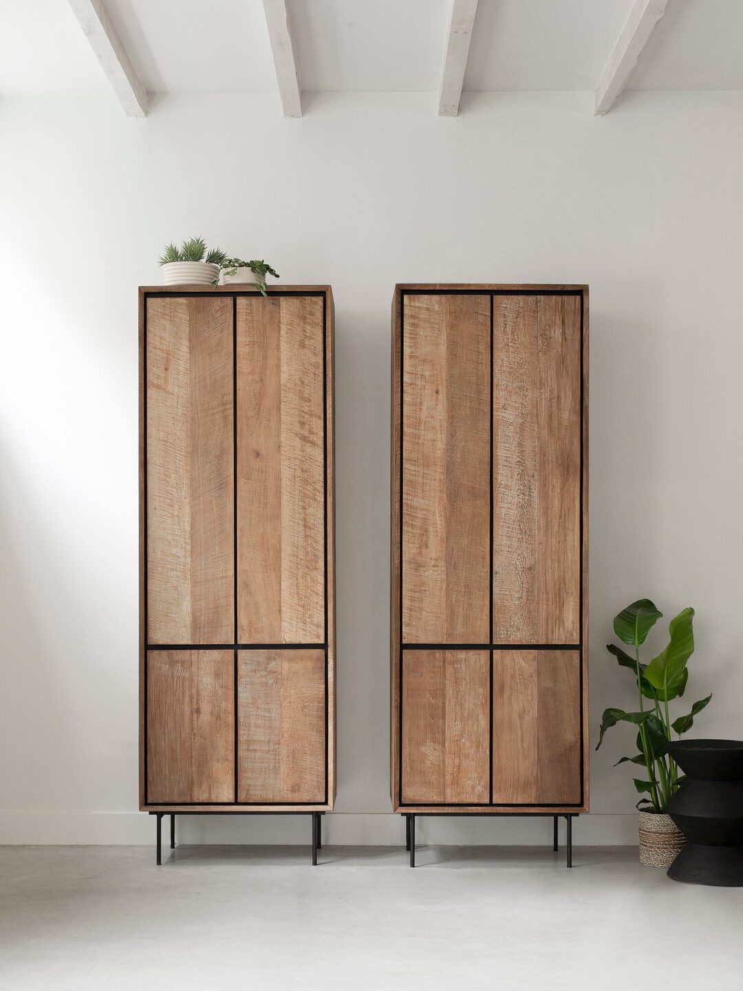 De bergkast Metropole is gemaakt van teakhout. De randen van de kast lopen schuin naar binnen, waardoor er diepte wordt gecreëerd. Samen met de ronde, metalen poten, greeploze lange deuren en donkere binnenkant heeft vitrinekast Metropole een robuust, maar gelijktijdig modern uiterlijk. De kast is modern, robuust en tegelijkertijd luchtig.