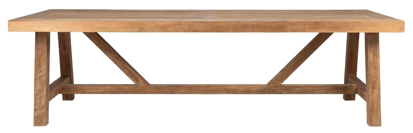 Eettafel Monastery heeft een rechthoekige vorm. Het tafelblad is 8 cm dik en heeft verstek gezaagde hoeken. De afmetingen van de eettafel zijn 78 x 280 x 100 cm, de tafel is ook verkrijgbaar in een kleinere maat, 250 cm. Al in al is deze eettafel een mooie natuurlijke toevoeging in je interieur. Ook leuk te combineren met eetbank Monastery.