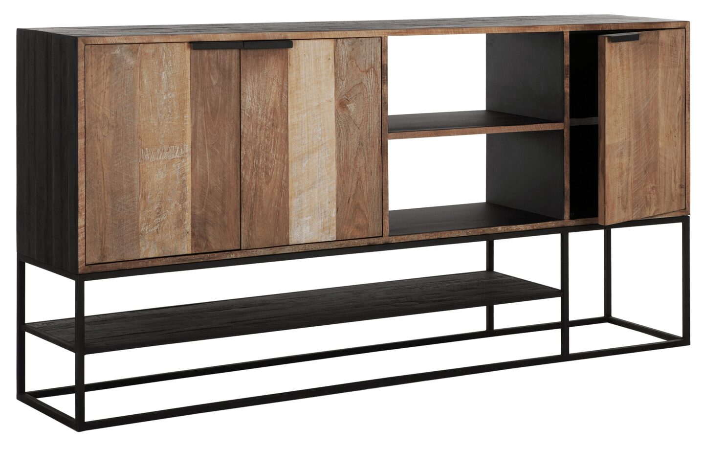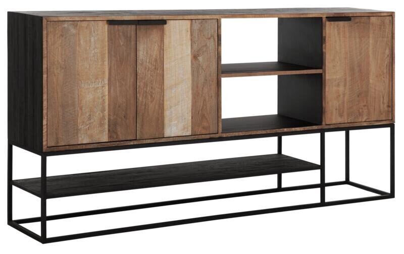 Dressoir Cosmo combineert naturel en zwart teakhout en is hiermee een opvallende verschijning. De afmetingen van het dressoir zijn 100x205x40 cm met 3 deuren en 2 open vakken. De serie heeft strakke metalen frames en prachtige zwarte deuren. De verfijnde handgrepen zorgen voor een mooi accent op het teakhout.