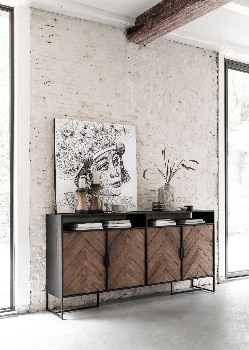 Als je op zoek bent naar bijzondere meubels, dan is de Criss Cross collectie vanDTP Interiors iets voor jou! Dit prachtige dressoir valt op dankzij het vissengraat patroon en de stoere stalen details. Dressoir Criss Cross beschikt over 4 deurtjes en twee open vakken en heeft een afmeting van 100x200x40 cm. De speelse pootjes maken dit meubel af.
