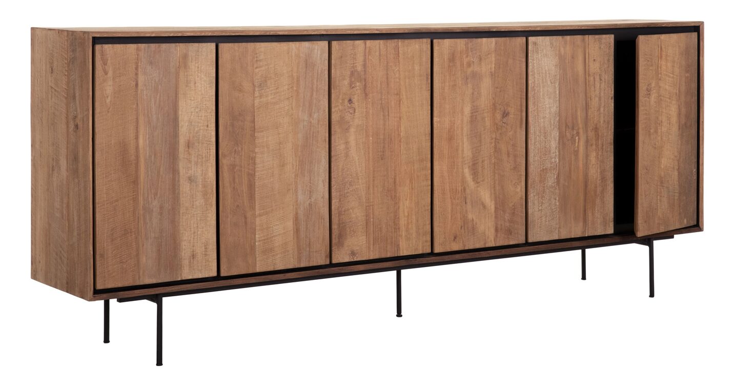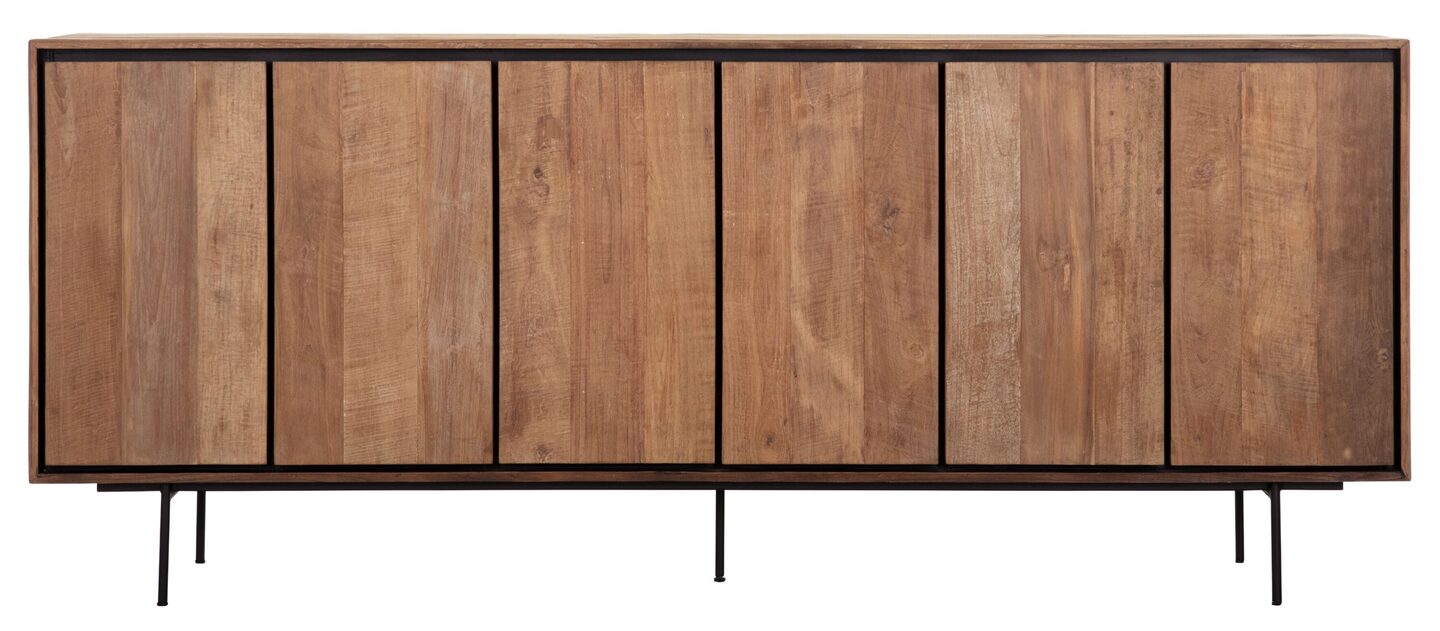 Dressoir 6 deuren uit de serie Metropole van DTP HOME is gemaakt van teakhout. De randen van de kast lopen schuin naar binnen, waardoor er diepte wordt gecreëerd. Samen met de ronde, metalen poten, greeploze lange deuren en donkere binnenkant heeft vitrinekast Metropole een robuust, maar gelijktijdig modern uiterlijk. De kast is modern, robuust en tegelijkertijd luchtig.
