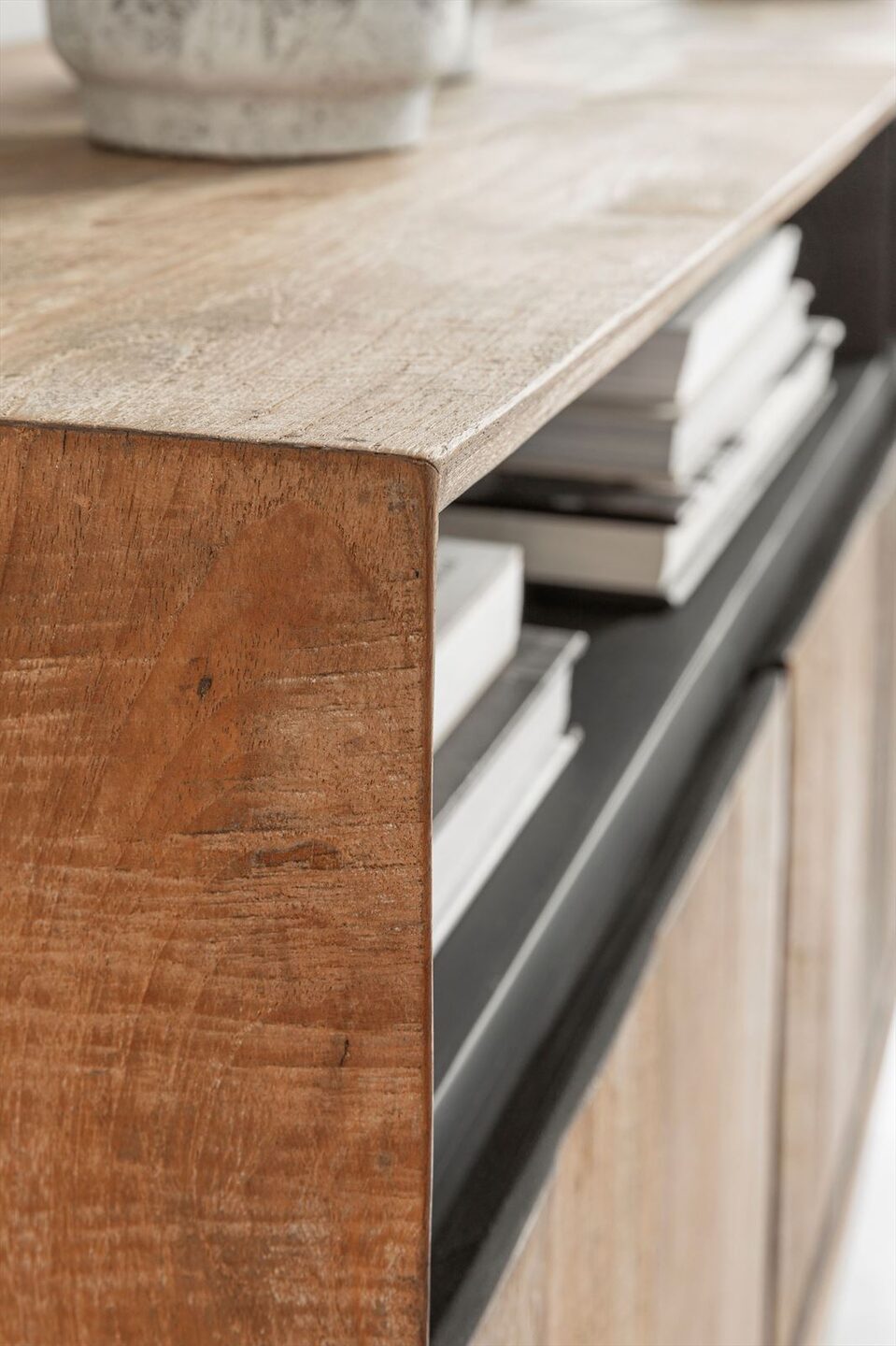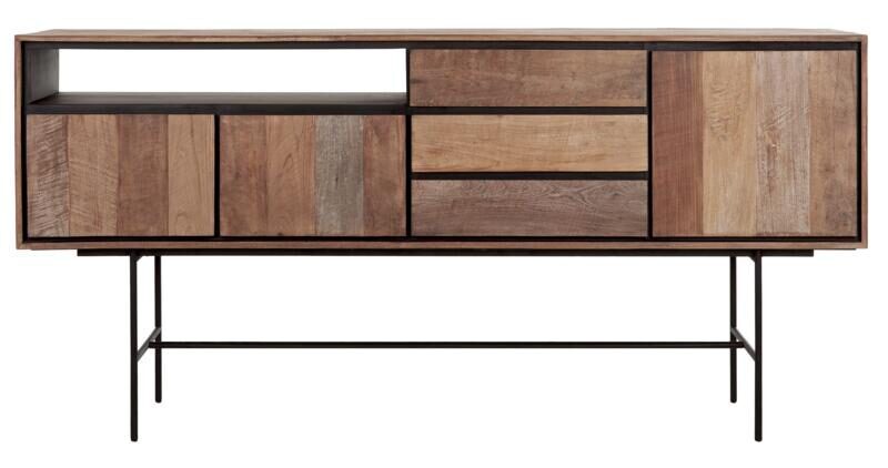 Metropole dressoir van DTP Home biedt voldoende opbergruimte. Dit sierlijke dressoir heeft namelijk drie kastdeurtjes, drie lades en een ruim open vak. Zo is er voldoende ruimte om spullen uit het zicht op te bergen. Het Metropole dressoir is gemaakt van gerecycled teakhout dat met de hand is bewerkt. Hierdoor zijn de scheurtjes, lijnen en onregelmatigheden op de opbergkast nog zichtbaar. Door de combinatie van het robuuste teakhout en de metalen accenten krijgt de kast een mooie, robuuste uitstraling.