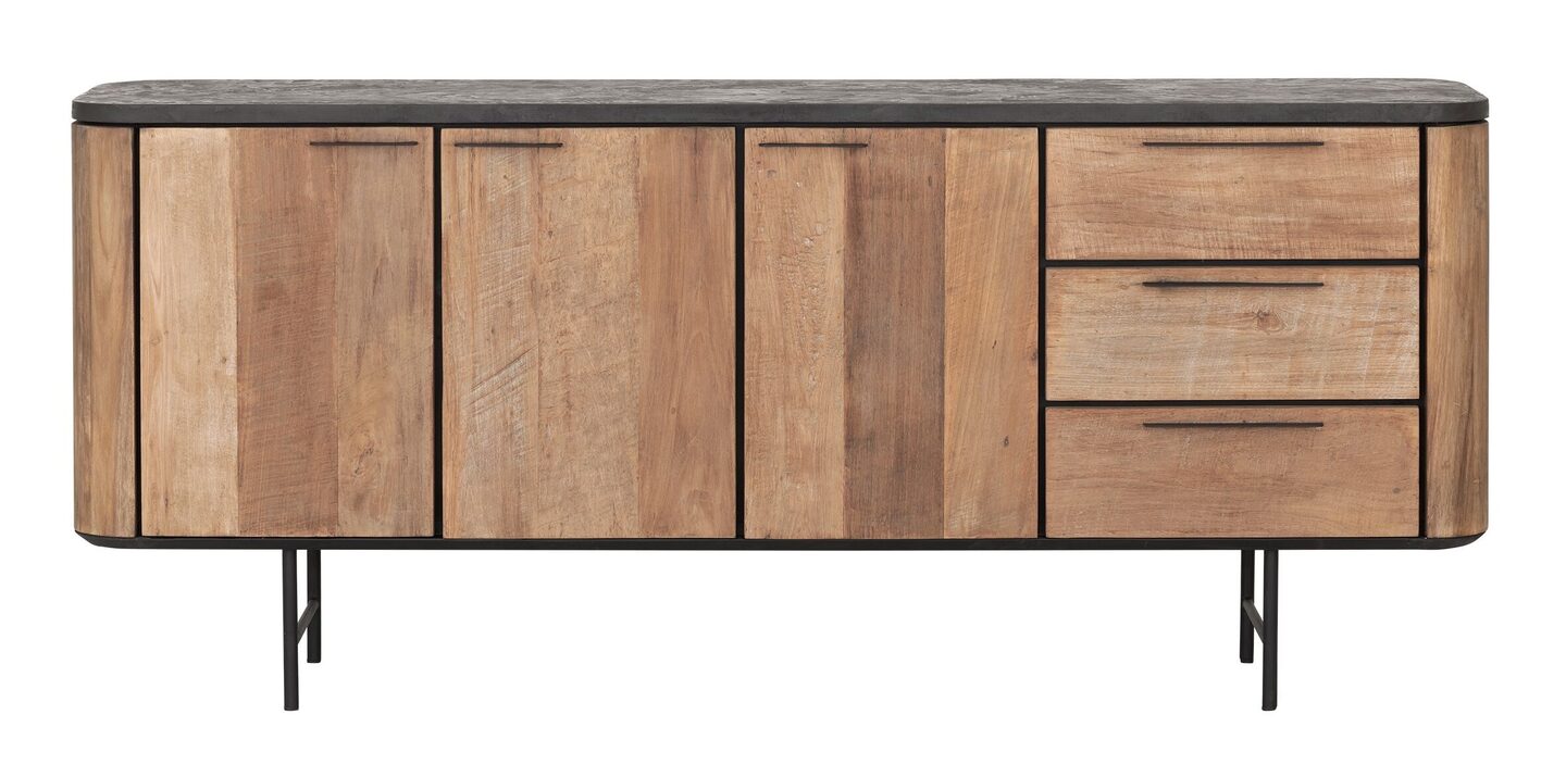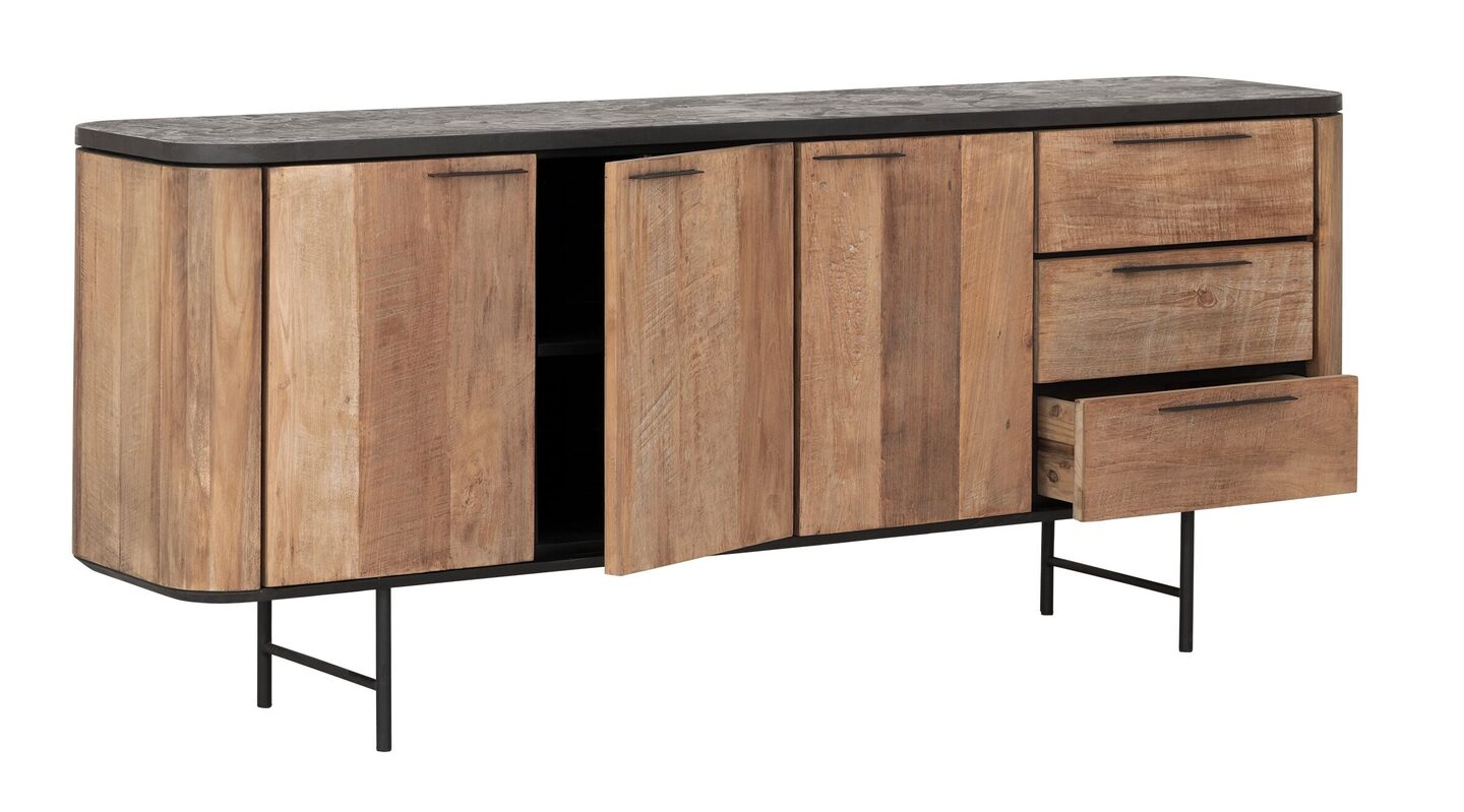 Het dressoir is gemaakt van gerecycled teakhout dat met de hand is bewerkt. Hierdoor zijn de scheurtjes, lijnen en onregelmatigheden op de opbergkast nog zichtbaar. Door de combinatie van het robuuste teakhout, het bovenblad van mortex en de metalen accenten krijgt de kast een stoere uitstraling.