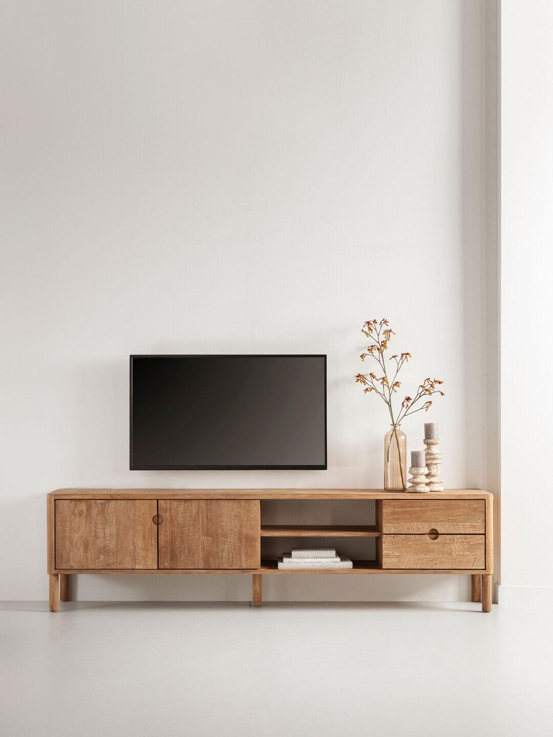 TV stand Apollo No.2 large, 2 doors, 2 open racks, 2 drawers,55x210x35 cm, recycled teakwood