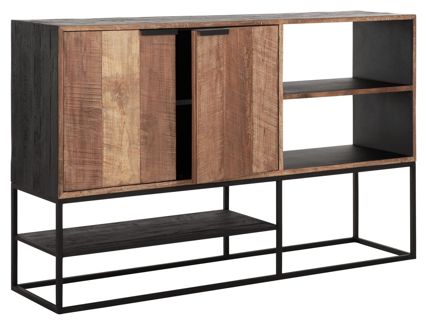 Dressoir Cosmo combineert naturel en zwart teakhout en is hiermee een opvallende verschijning. De afmetingen van het dressoir zijn 100 x 160 x 40 cm met 2 deuren en 2 open vakken. De zwart en naturel tinten binnen deze serie vormen spannende contrasten. De serie heeft strakke metalen frames en prachtige zwarte deuren. De verfijnde handgrepen zorgen voor een mooi accent op het teakhout.