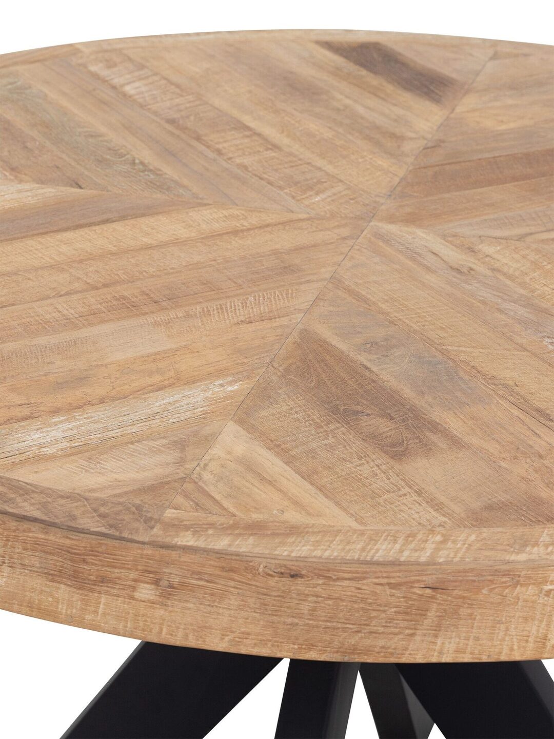 Eettafel Einstein heeft een eigenaardig grafisch patroon welke wordt gecreëerd door de naar het midden toe gelegde Hongaarse punt. Dit grafische werk van gerecycled teakhout is afgewerkt met een houten omlijsting.