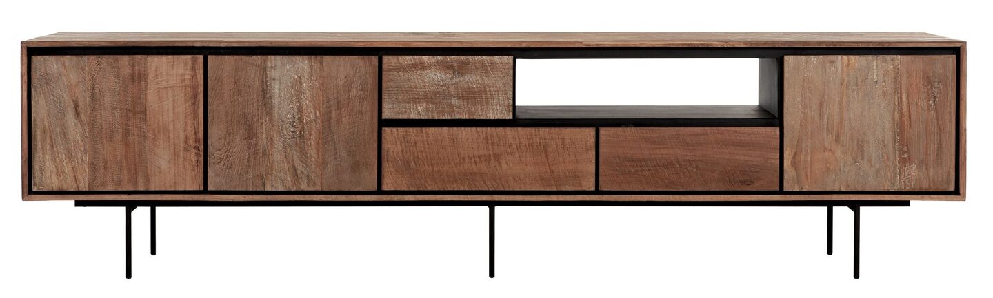 Het metropole tv-meubel van DTP Home biedt voldoende opbergruimte. Dit karaktervolle tv-dressoir heeft 3 kastdeurtjes, drie lades en een ruim open vak. Zo is er voldoende ruimte om de afstandsbediening en andere spullen op te bergen, maar wel uit het zicht. De Metropole is gemaakt van gerecycled teakhout dat met de hand is bewerkt. Hierdoor zijn de scheurtjes, lijnen en onregelmatigheden op de opbergkast nog zichtbaar. Door de combinatie van het robuuste teakhout en de metalen accenten krijgt de kast een stoere uitstraling.