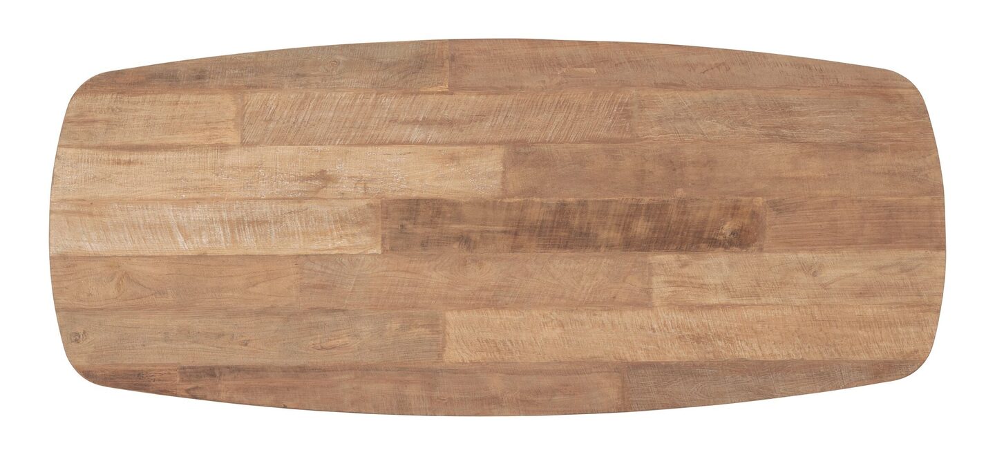 Het schuin afgewerkte tafelblad van eettafel Soho is gemaakt van gerecycled teakhout. Dit prachtige blad met afgeronde hoeken zorgt er, in combinatie met het moderne zwartstalen onderstel, voor dat de eettafel een vriendelijke en strakke uitstraling heeft. Eettafel Soho heeft een afmeting 76x260x110 cm en is ook verkrijgbaar in 210 cm.