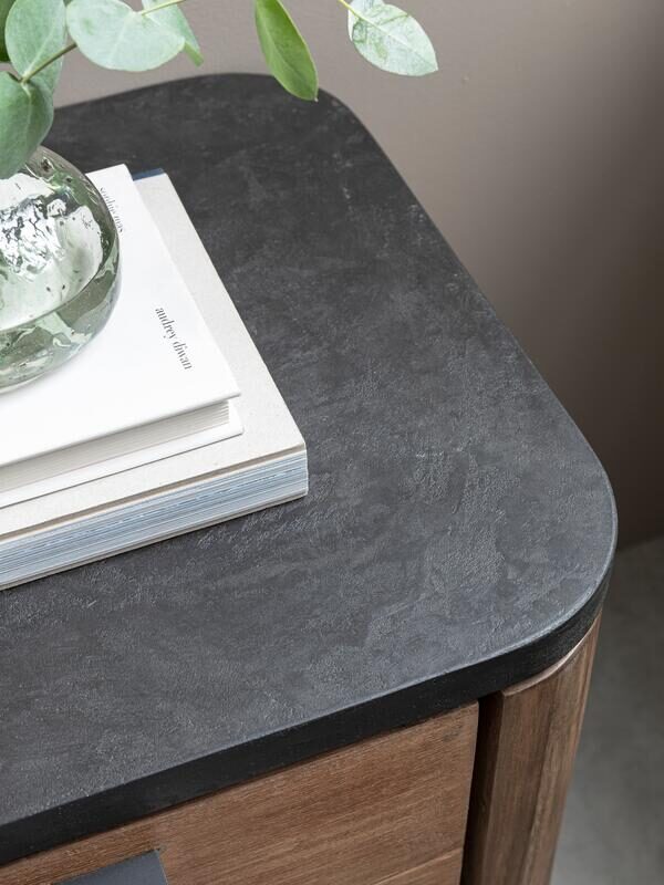 Het Tv-meubel is gemaakt van gerecycled teakhout dat met de hand is bewerkt. Hierdoor zijn de scheurtjes, lijnen en onregelmatigheden op de opbergkast nog zichtbaar. Door de combinatie van het robuuste teakhout, het bovenblad van mortex en de metalen accenten krijgt de kast een stoere uitstraling.