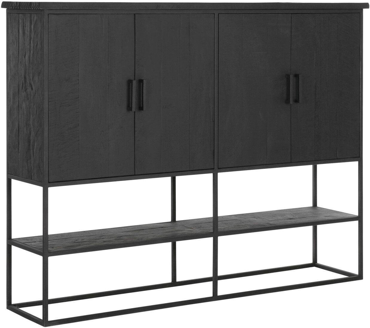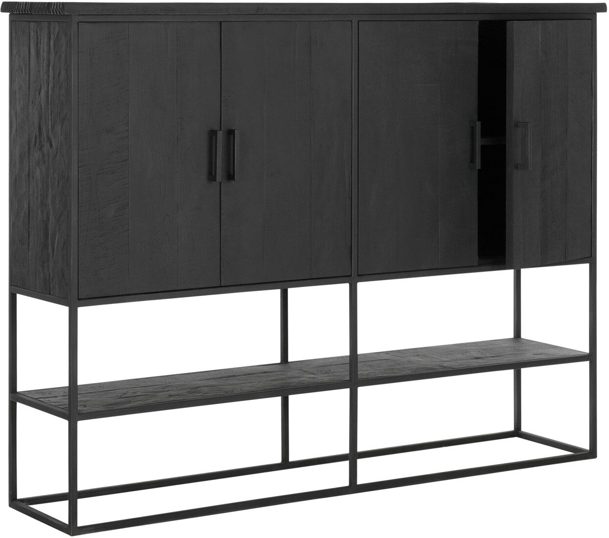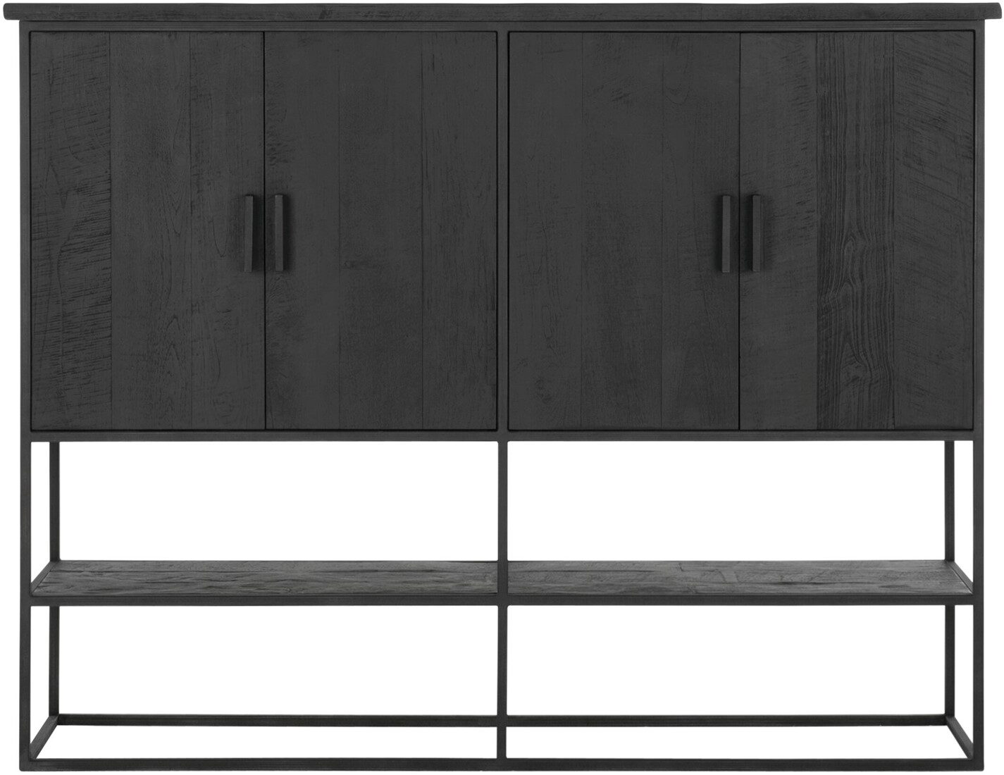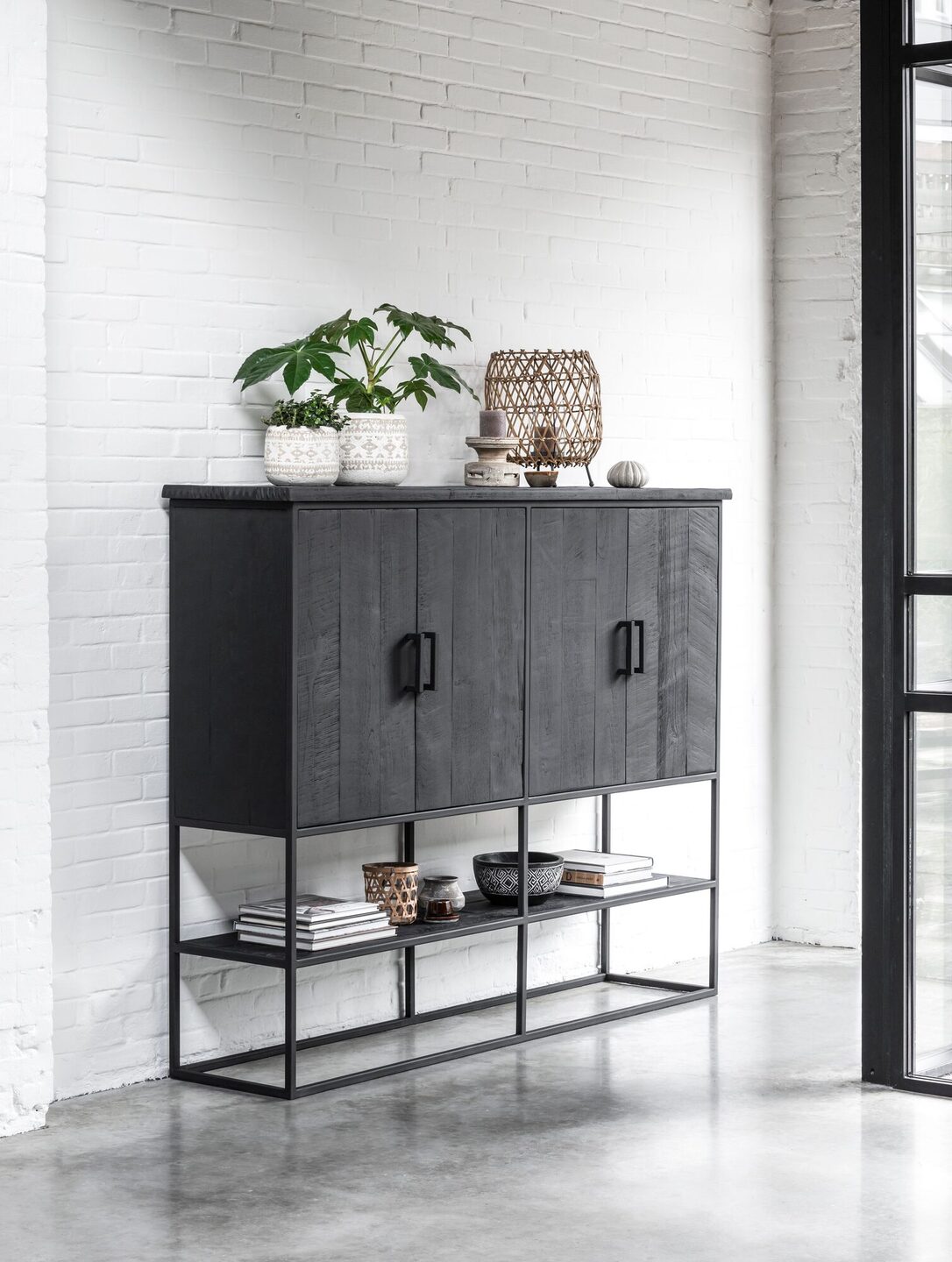 Bergkast Beam large is een meubel uit de collectie van DTP Home Timeless Black. De kast is gemaakt van gerecycled teakhout en voorzien van een zwarte beits met een transparante lak. De afmeting van de bergkast is 140x180x40 cm en bestaat uit 4 deuren en 1 open vak.