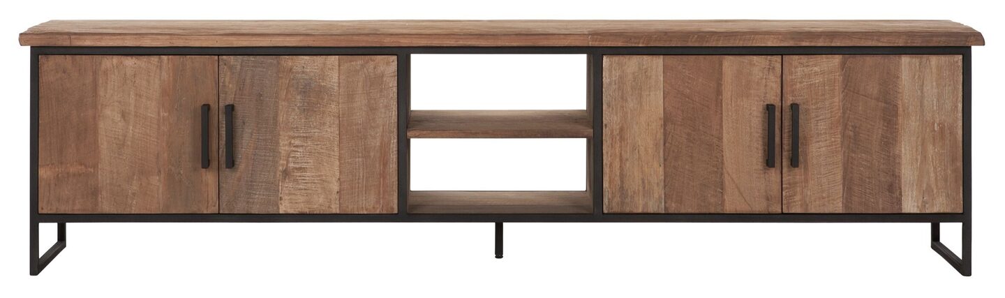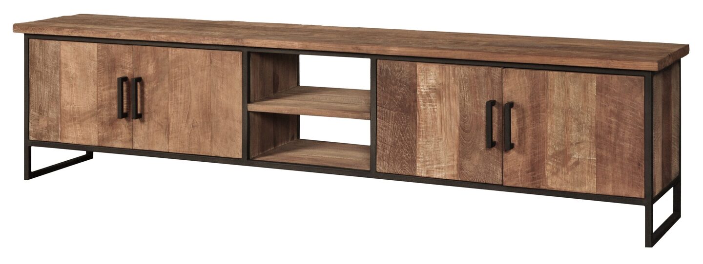 TV meubel Beam is gemaakt van teakhout en is afgewerkt met een metalen frame. Het meubel heeft een afmeting van 55x220x40 cm en heeft 4 deuren en 2 open vakken.