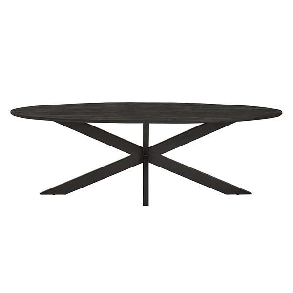 De eetkamertafels uit deze collectie zijn gemaakt van massief mangohout (3 cm). Het blad is zwart gezandstraald (mat gelakt) en heeft een verjongde rand. Het onderstel (5x10) is gemaakt van metaal met een zwarte poedercoating. De combinatie van de zwarte kleur, de ronde vorm en de verjongde rand geven de eetkamertafel een moderne look. Hoe gezellig is het dat iedereen aan kan schuiven en elkaar aan kan kijken aan deze tafel?