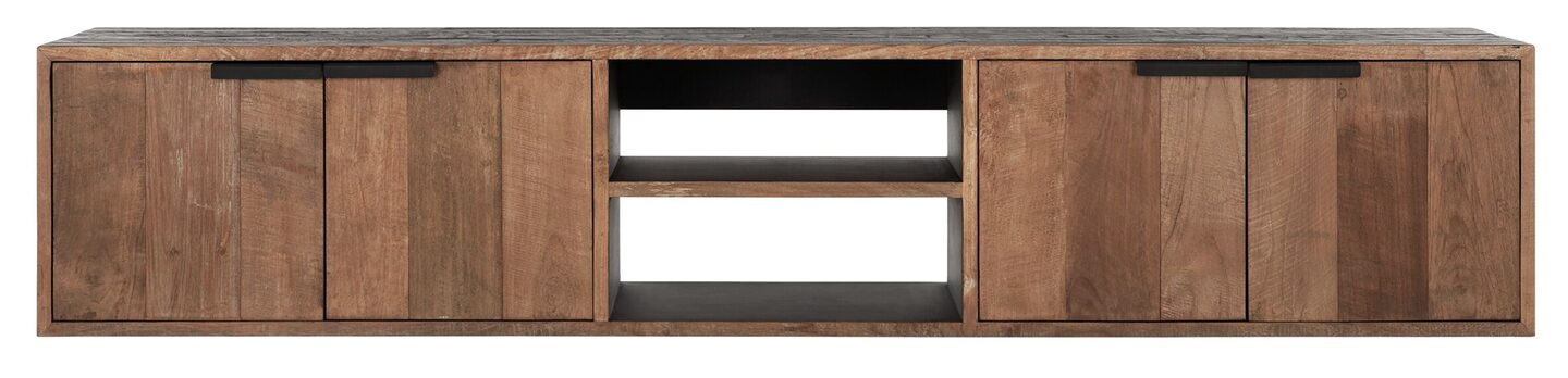 Het tv meubel heeft verrassend veel opbergruimte achter de vier deuren. De 2 open vakken bieden vele opbergmogelijkheden van bijvoorbeeld tijdschriften. Omdat de poten ontbreken lijkt het meubel te zweven aan de wand. Het creëert harmonie en rust aan de muur en is perfect te combineren met bijvoorbeeld de salontafel uit de gelijknamige serie. De zijkanten van het meubel zijn zwart gebeitst, een prachtig contract met het teakhout. Ook de binnenkant van de open vakken is zwart gebeitst. Het tv meubel is 205 cm en 40 cm diep, maar is ook mogelijk in de maten small en medium. Het tv meubel small is 125 cm breed en medium is 165 cm breed. Liever een meubel op pootjes? Ook dat is mogelijk binnen de Cosmo serie, het meubel krijgt dan een prachtig metalen frame.