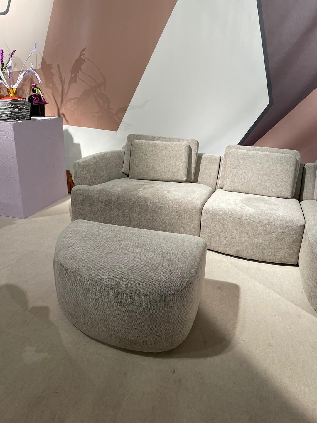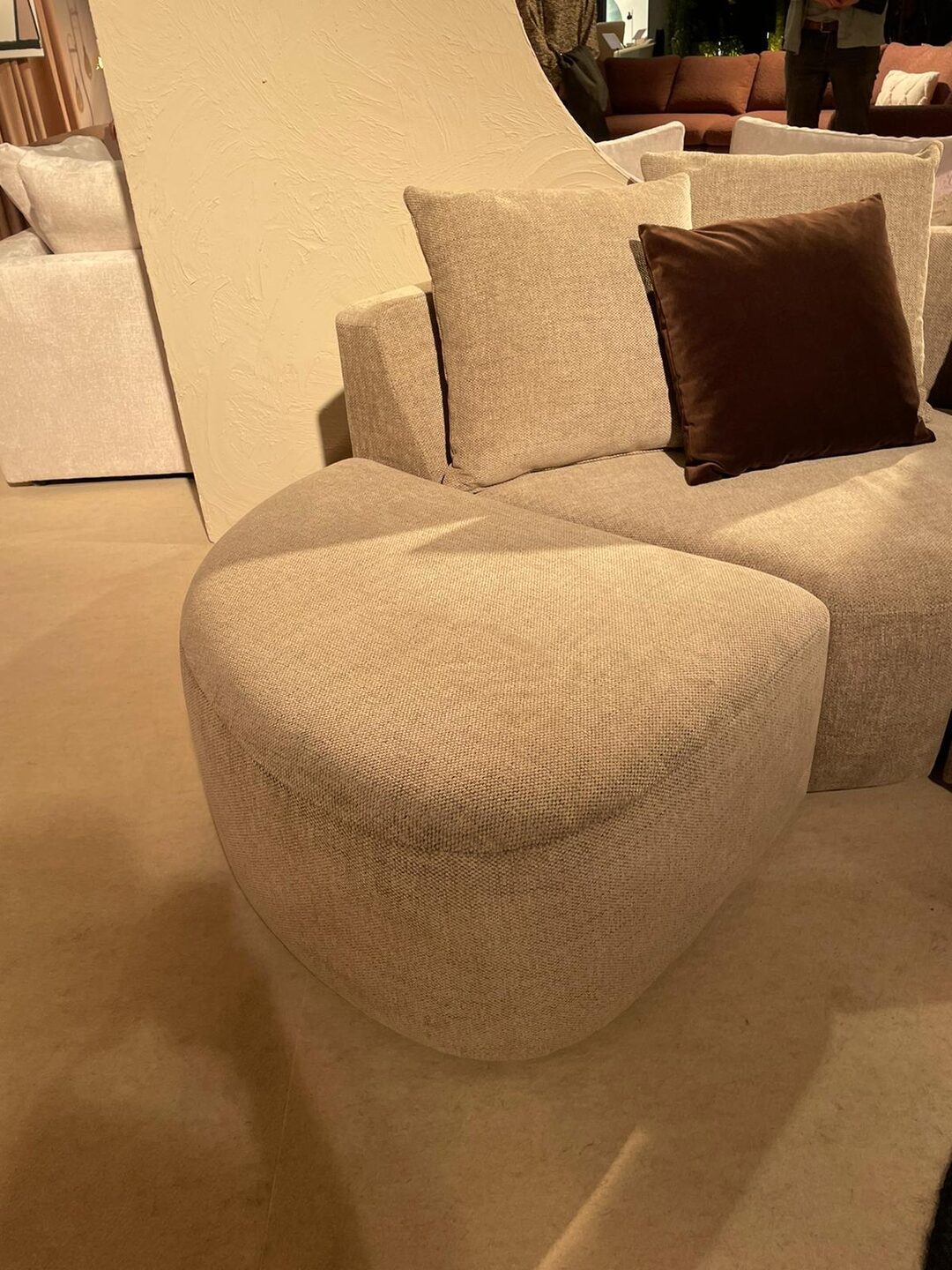 De bank is in onze winkel te zien zoals op de eerste foto en heeft dan de volgende opstelling: linkse 1,5 zits XL met arm, 1.5 zits zonder armen, Divan rond rechts in de stof Touch/02/beige en kost € 2599.- Deze opstelling is 375 cm breed, 82 cm hoog en 165 cm diep