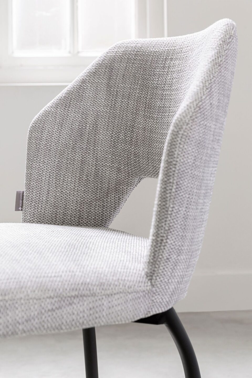 Eetkamerstoel Bloomvan het Nederlandse lifestyle merk MUST Living heeft een afmeting van 82x54x57 cm. De zitting is bekleed met polyester in een lichtgrijze kleur. De stoel is afgewerkt met zwarte poten.