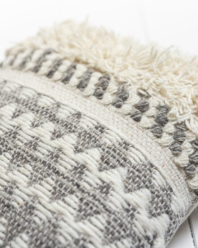 Kussen Aura is een combinatie van verschillende grijs tinten. Het kussen is gemaakt van wol en katoen. Door het patroon geeft het een speelse twist aan je interieur. De afmetingen van kussen Aura zijn 45x45 cm. Er is ook een bijpassende Poef Aura.