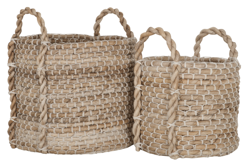 De manden Patio zijn gemaakt van bananenblad in combinatie met katoenen touw. De manden hebben een afmeting van 32xØ35 cm en 40xØ45 cm.