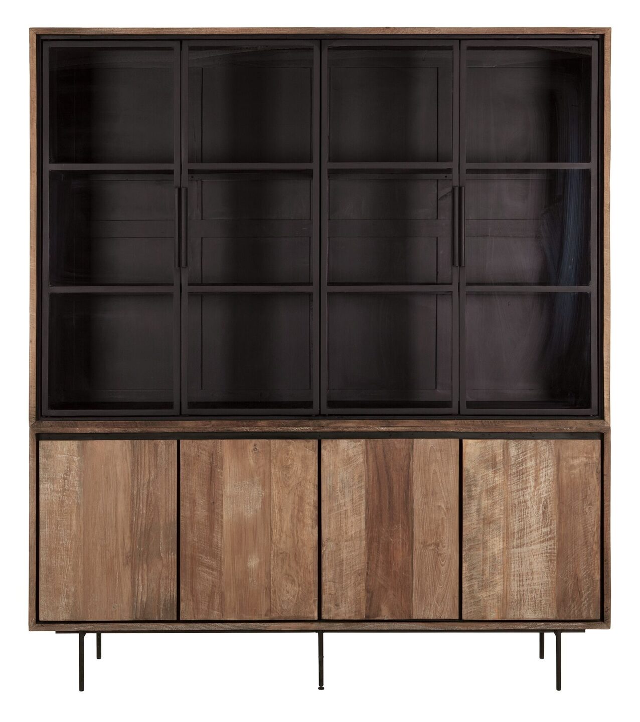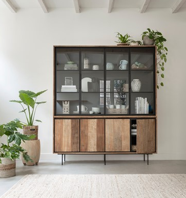 Vitrinekast Metropole van DTP Home biedt veel opbergruimte. De drie royale legplanken achter de glazen deurtjes bieden voldoende opbergruimte voor je kostbare spullen. Deze komen extra mooi uit door de donkere achtergrond in de kast. Ook biedt de kast nog opbergruimte voor spullen die je uit het zicht wil opbergen, deze kunnen achter de houten frontjes geplaatst worden. De serie Metropole is gemaakt van gerecycled teakhout dat met de hand is bewerkt. Hierdoor zijn de scheurtjes, lijnen en onregelmatigheden op de opbergkast nog zichtbaar. Door de metalen accenten, zoals de poten van de kast, krijgt de wandkast een stoer en robuust uiterlijk.