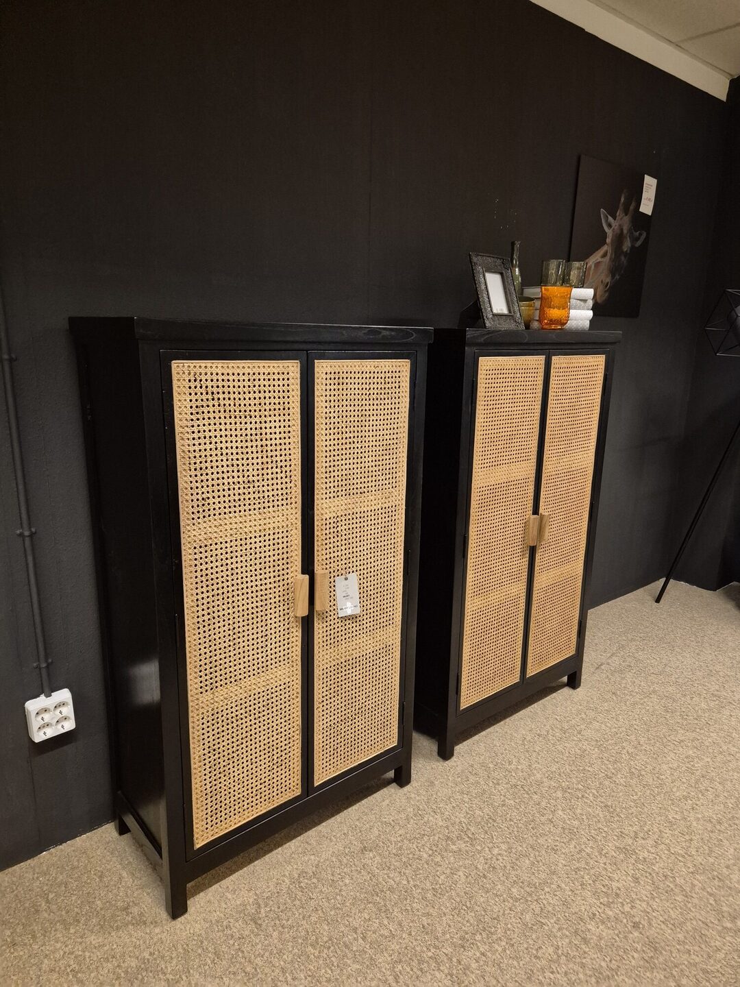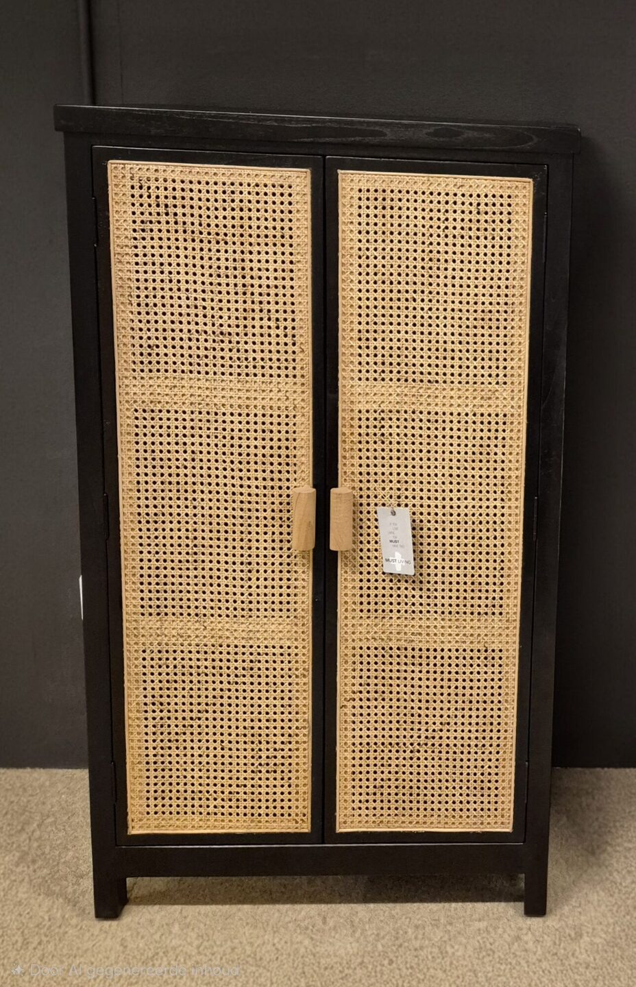 Deze leuke kast is gemaakt van mindi hout in de kleur zwart en heeft twee webbing deuren.