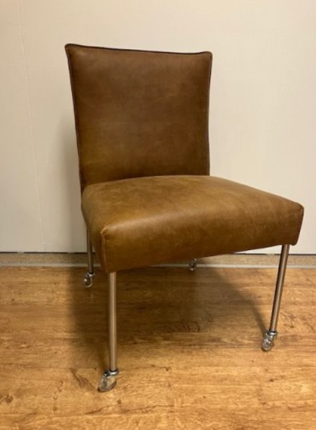 De stoel Kelvin is een stoere, robuuste eetkamerstoel, die zowel met als zonder armleuning gefabriceerd kan worden. Er is de mogelijkheid uit vele ledersoorten en kleuren, maar voor een hippe look kan er ook een keuze gemaakt worden uit verschillende trendy stoffen. De poot is te verkrijgen met en zonder skate wiel en in de kleur zwart.