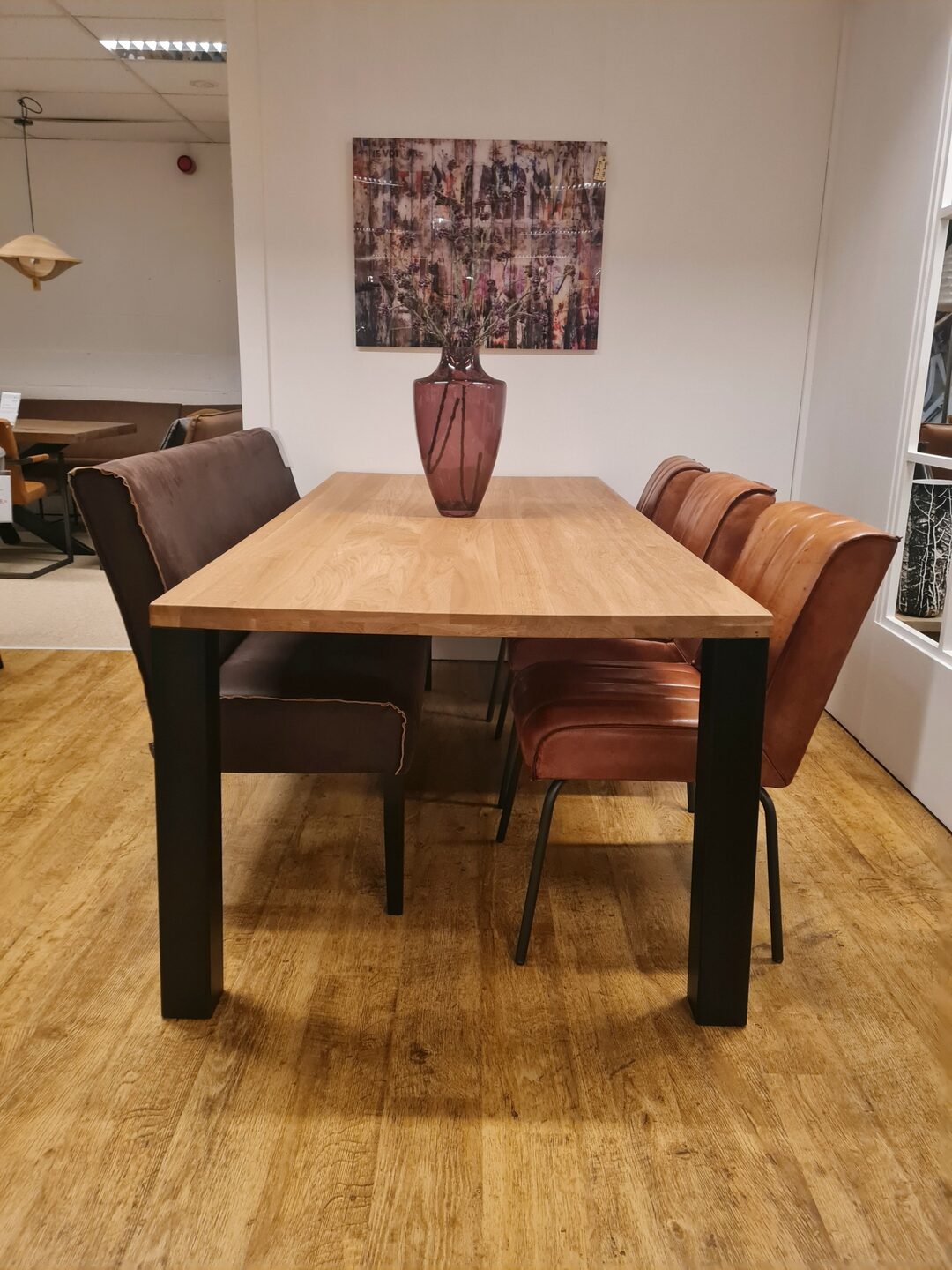 Deze eiken tafel in naturel kleur heeft een afmeting van 220 x 100 cm. De tafel heeft zwart metalen poten. Dit betreft een showmodel.