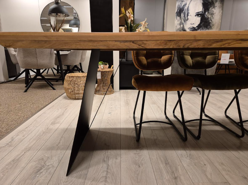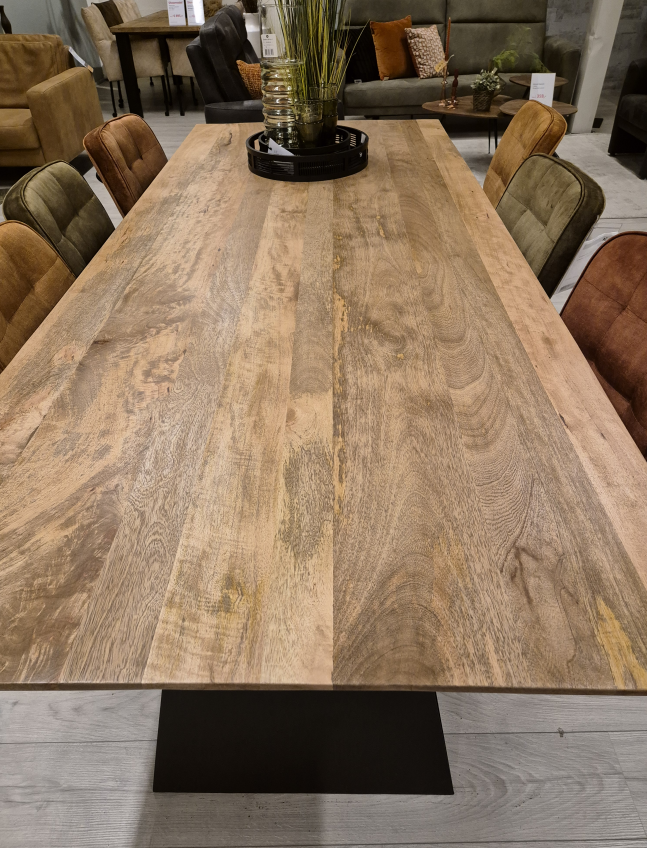 Deze tafel is gemaakt van een mangohouten blad en een zwart metalen onderstel. De tafel betreft een showmodel en is direct leverbaar.