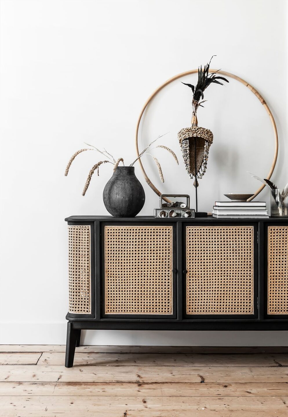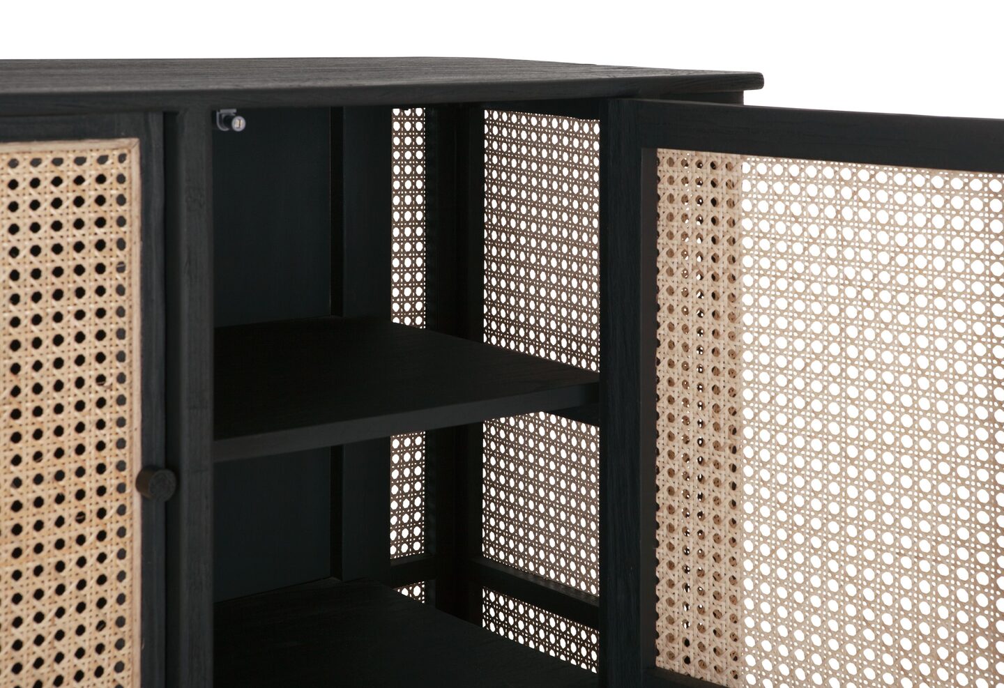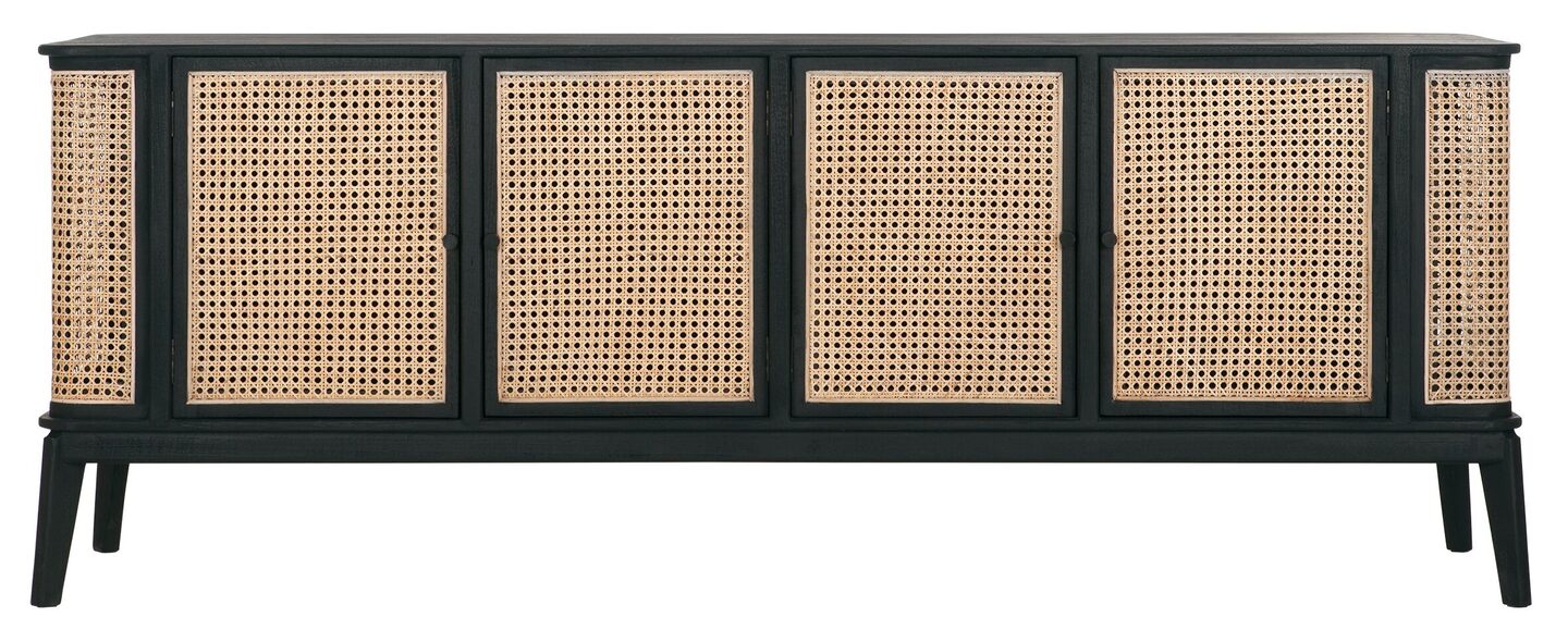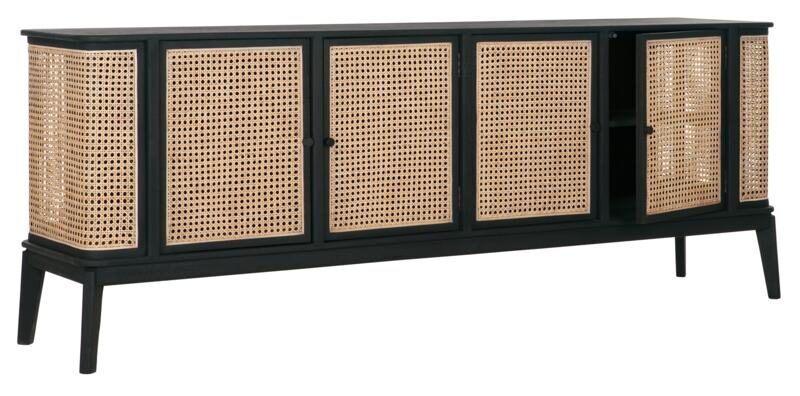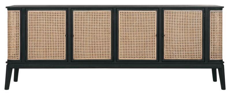 Het Dressoir Raffles van het Nederlandse lifestyle merk MUST Living heeft een afmeting van 80x213x48cm. Het dressoir is ook verkrijgbaar in lengtemaat, 125 cm. Het dressoir heeft 4 deuren waardoor er genoeg spullen in opgeborgen kunnen worden. De combinatie van het zwarte mindi-hout en naturel kleur webbing zorgt voor een retro look.