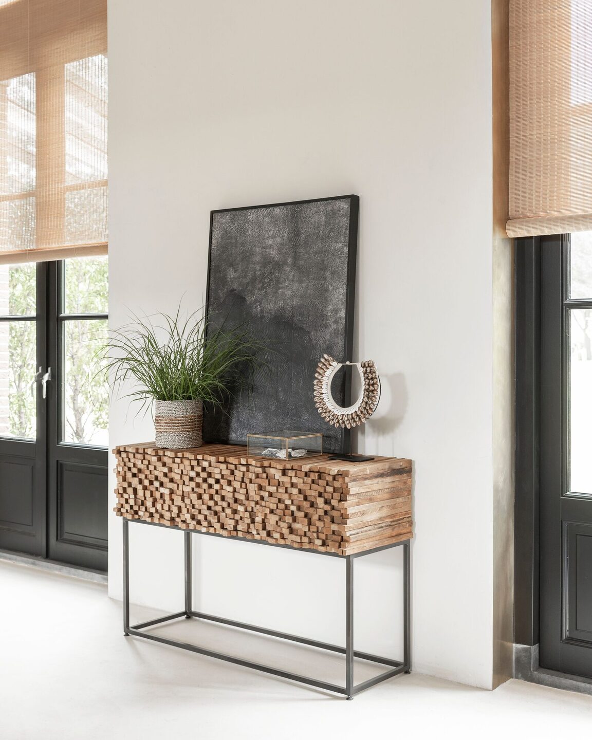 Een bijzondere en opvallend meubel, dat is wandtafel Sticks zeker. De wandtafel is namelijk gemaakt van verschillende balkjes hout. Dit geeft een speels en stoer effect. Wandtafel Sticks heeft een afmeting van 80x125x40 cm.