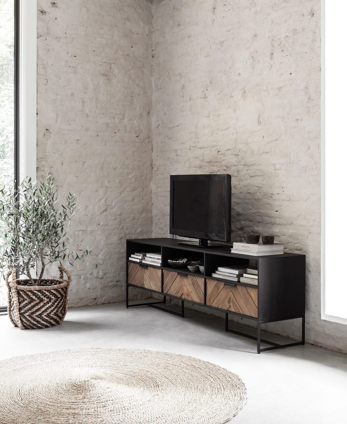 Als je op zoek bent naar bijzondere meubels, dan is de Criss Cross collectie vanDTP Interiors iets voor jou. Dit prachtige tv-meubel valt op dankzij het vissengraat patroon en de stoere stalen details. Tv-meubel Criss Cross beschikt over 3 lades en 3 open vakken en heeft een afmeting van 60x180x40 cm. De speelse pootjes maken dit meubel af.