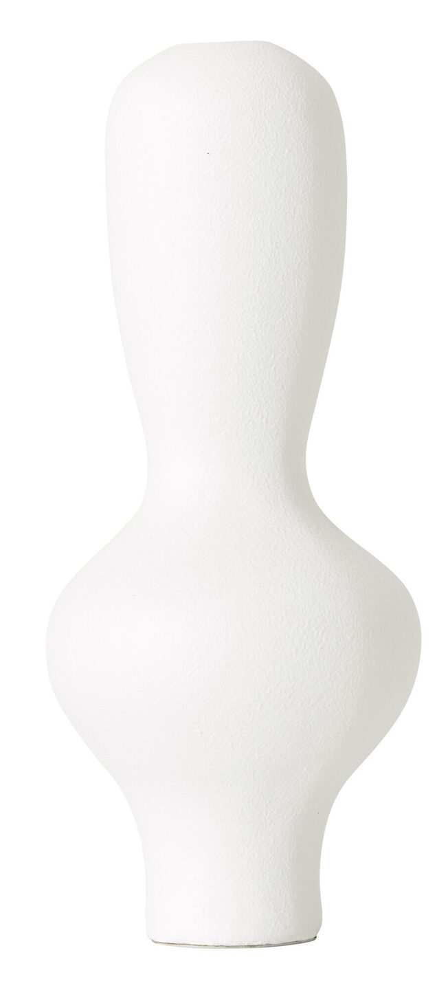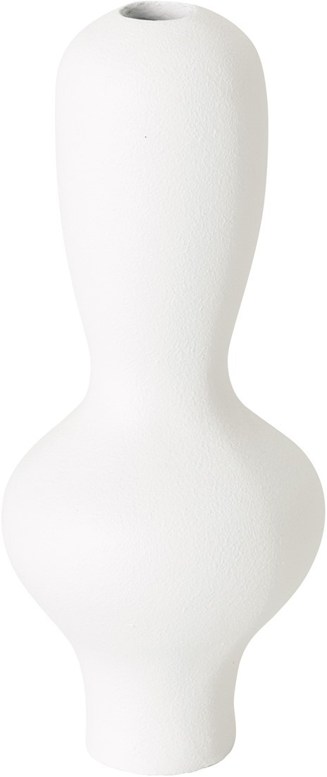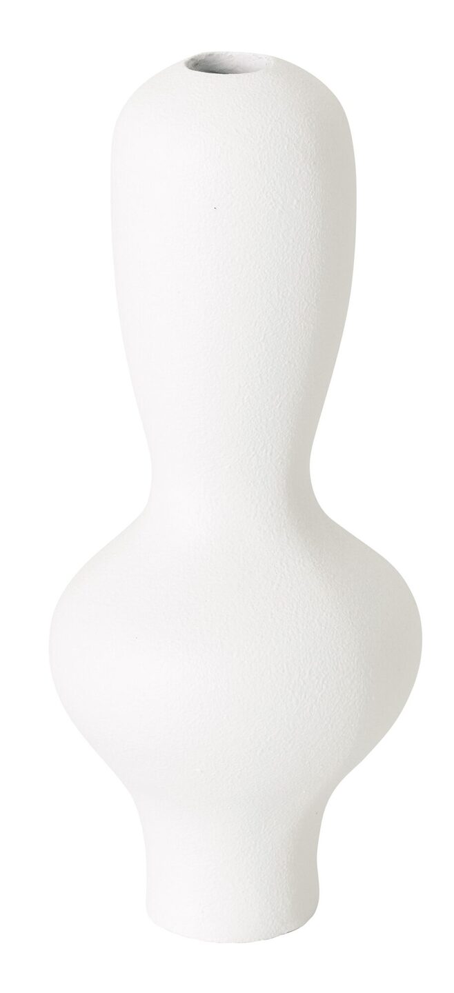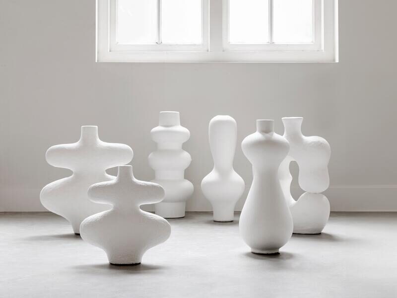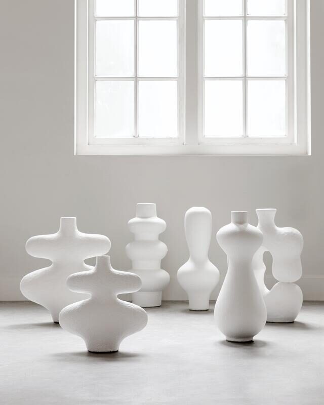 Deze vazen uit de Must Living Collectie zijn gemaakt van kleurloos fiber cement en vervolgens geverfd met een dikke witte structuurverf. De vazen zijn egaal van kleur, wat de nadruk legt op de vorm en structuur.